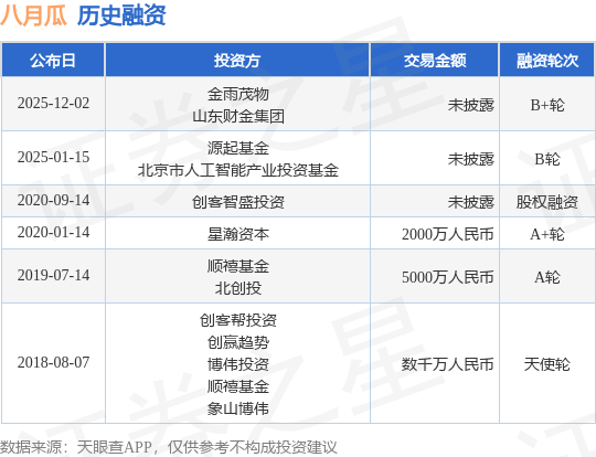 证券之星消息,根据天眼查APP于12月2日公布的信息整理,北京八月瓜科技有限公司B+轮融资,融资额未披露,参与投资的机构包括金雨茂物,山东财金集团。