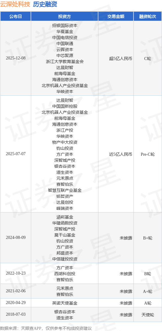 证券之星消息,根据天眼查APP于12月8日公布的信息整理,杭州云深处科技股份有限公司C轮融资,融资额超5亿人民币,参与投资的机构包括招银国际资本,华夏基金,中国电信投资,中国联通,云晖资本,中芯聚源,浙江大学教育基金会,达晨财智,前海母基金,海通创意资本,北京机器人产业投资基金,华映资本。