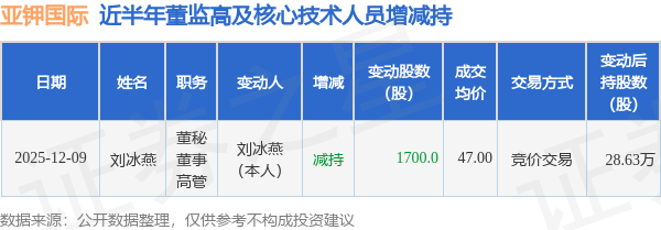 亚钾国际近半年内的董监高及核心技术人员增减持详情如下: