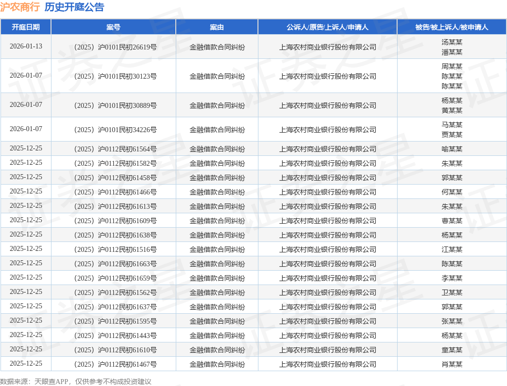 案号:(2025)沪03清申860号根据统计,近一年内以上海农村商业银行股份有限公司为当事人的历史开庭公告有1527则,其中案由为“金融借款合同纠纷”的公告以1373则居首,其次为“信用卡纠纷”有141则,“侵害作品信息网络传播权纠纷”有5则。历史开庭公告(前20条)如下: