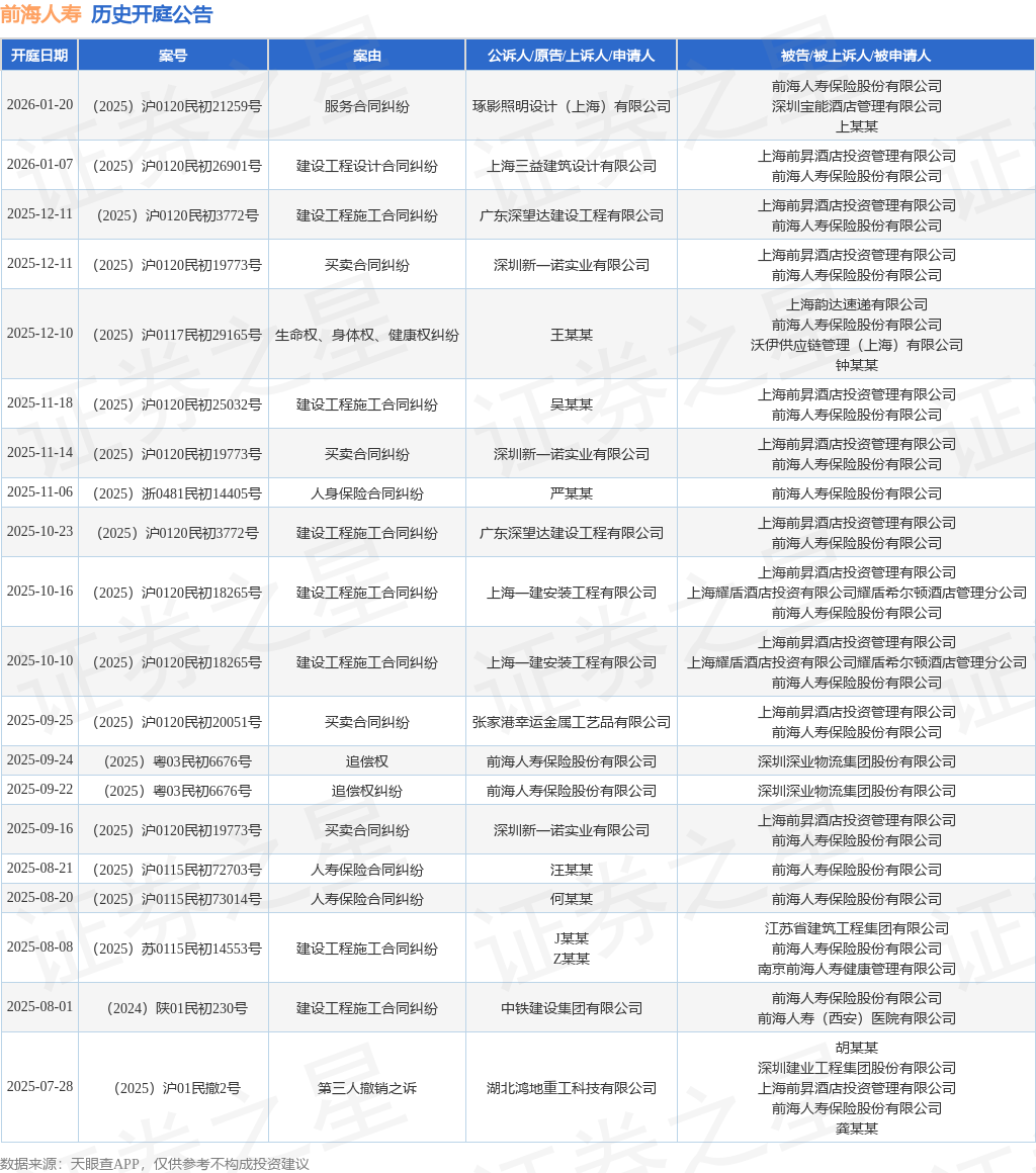案号:(2025)沪0120民初3772号根据统计,近一年内以前海人寿保险股份有限公司为当事人的历史开庭公告有55则,其中案由为“建设工程施工合同纠纷”的公告以16则居首,其次为“买卖合同纠纷”有5则,“人身保险合同纠纷”有4则。历史开庭公告(前20条)如下:
