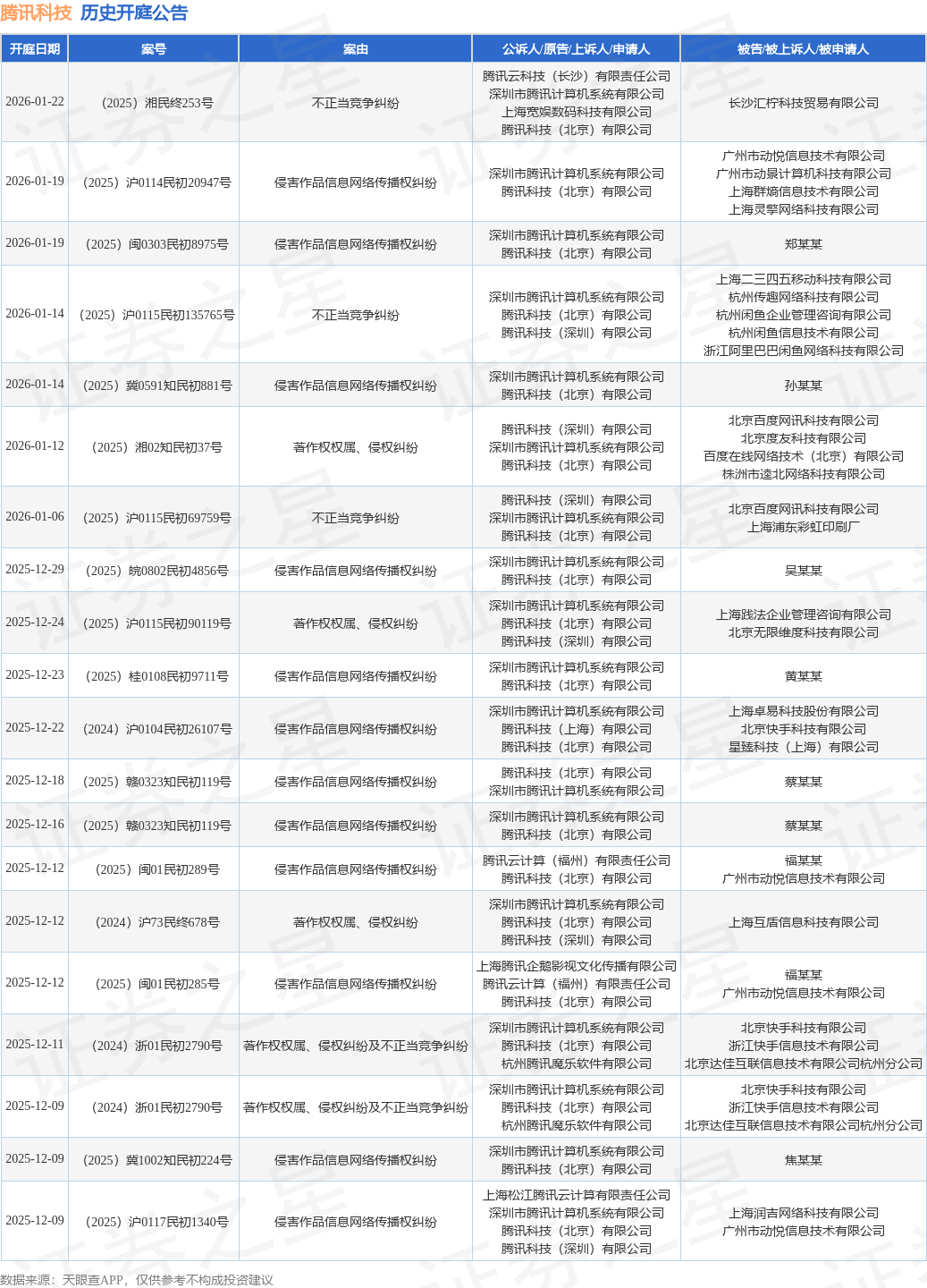 案号:(2024)沪73民终678号根据统计,近一年内以腾讯科技(北京)有限公司为当事人的历史开庭公告有262则,其中案由为“侵害作品信息网络传播权纠纷”的公告以175则居首,其次为“不正当竞争纠纷”有21则,“著作权权属、侵权纠纷”有16则。历史开庭公告(前20条)如下: