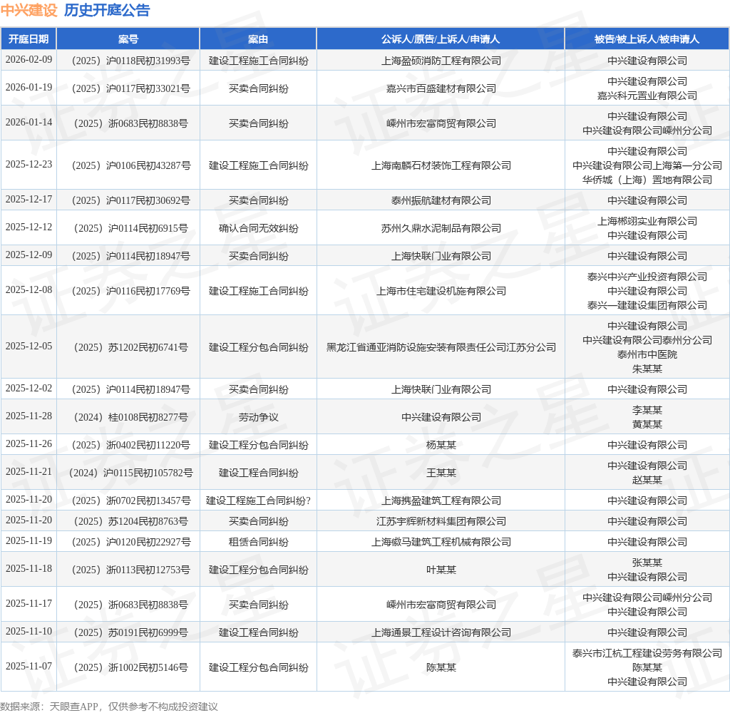 案号:(2025)沪0114民初6915号根据统计,近一年内以中兴建设有限公司为当事人的历史开庭公告有585则,其中案由为“建设工程施工合同纠纷”的公告以150则居首,其次为“买卖合同纠纷”有104则,“建设工程分包合同纠纷”有91则。历史开庭公告(前20条)如下: