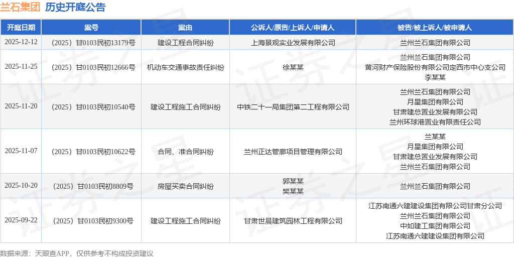 案号:(2025)甘0103民初13179号根据统计,近一年内以兰州兰石集团有限公司为当事人的历史开庭公告有6则,其中案由为“建设工程施工合同纠纷”的公告以2则居首,其次为“合同、准合同纠纷”有1则,“建设工程合同纠纷”有1则。历史开庭公告如下: