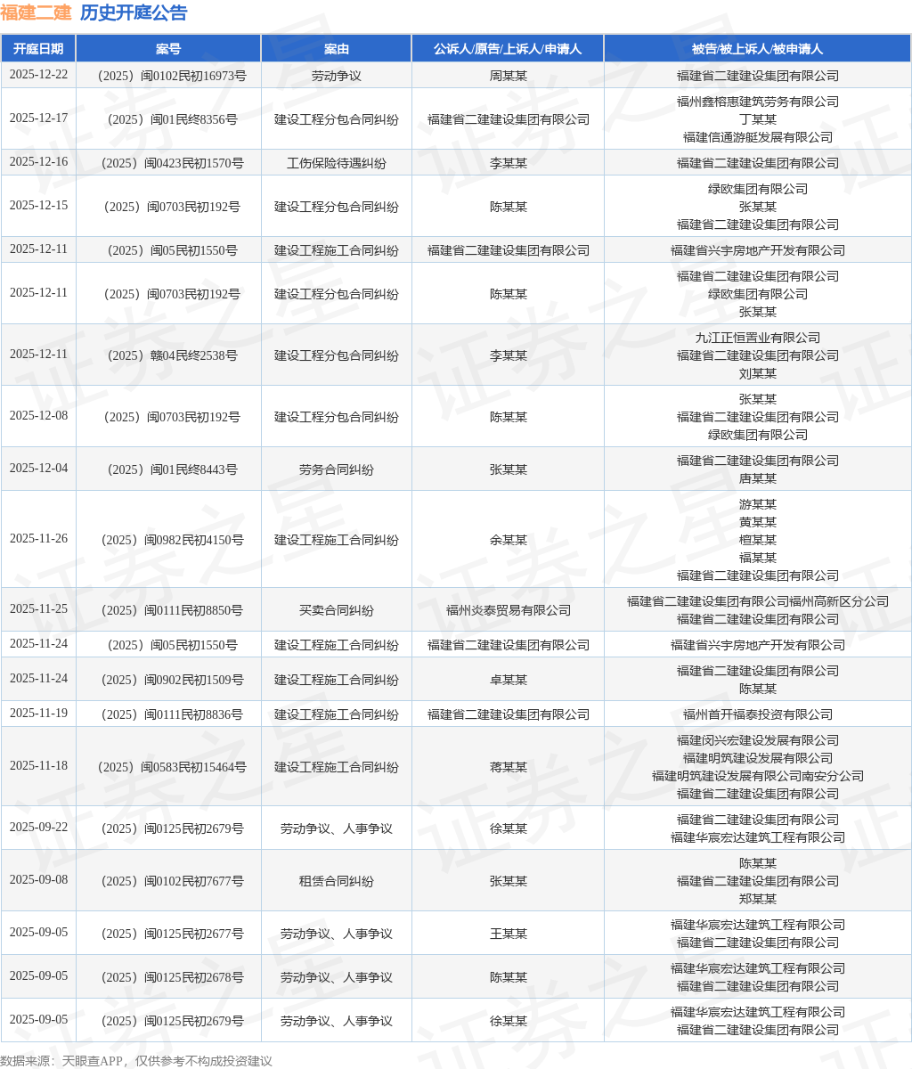 案号:(2025)闽05民初1550号根据统计,近一年内以福建省二建建设集团有限公司为当事人的历史开庭公告有104则,其中案由为“建设工程施工合同纠纷”的公告以29则居首,其次为“建设工程分包合同纠纷”有14则,“劳务合同纠纷”有12则。历史开庭公告(前20条)如下: