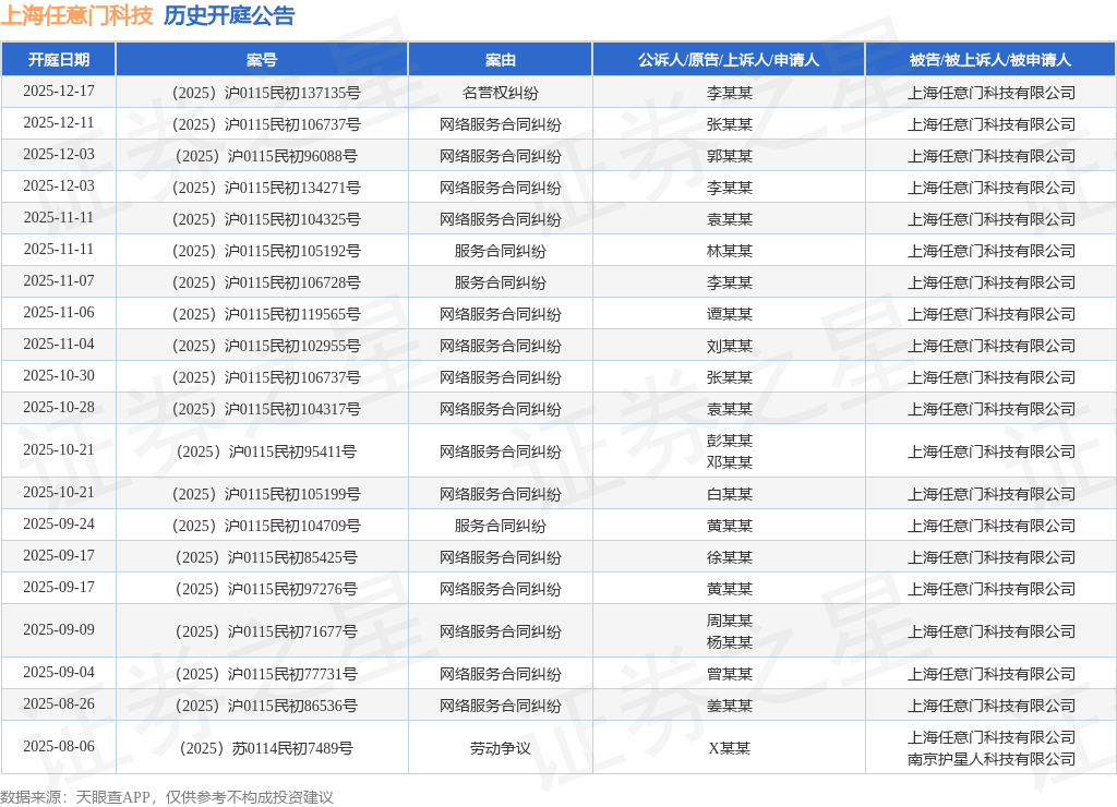 案号:(2025)沪0115民初106737号根据统计,近一年内以上海任意门科技有限公司为当事人的历史开庭公告有46则,其中案由为“网络服务合同纠纷”的公告以24则居首,其次为“服务合同纠纷”有10则,“著作权侵权”有4则。历史开庭公告(前20条)如下: