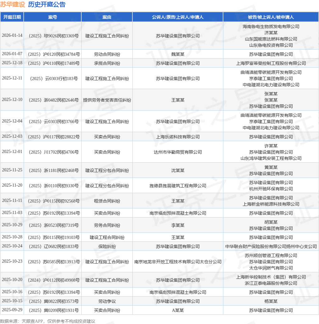 案号:(2025)云0303行初183号根据统计,近一年内以苏华建设集团有限公司为当事人的历史开庭公告有193则,其中案由为“买卖合同纠纷”的公告以37则居首,其次为“建设工程施工合同纠纷”有34则,“劳务合同纠纷”有20则。历史开庭公告(前20条)如下: