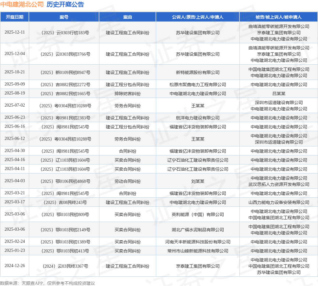 案号:(2025)云0303行初183号根据统计,近一年内以中电建湖北电力建设有限公司为当事人的历史开庭公告有23则,其中案由为“买卖合同纠纷”的公告以6则居首,其次为“建设工程施工合同纠纷”有6则,“建设工程分包合同纠纷”有4则。历史开庭公告(前20条)如下: