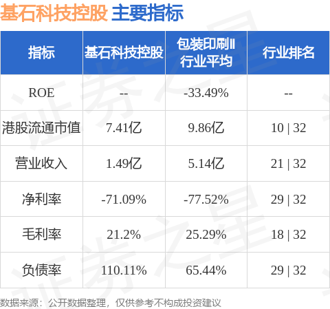 基石科技控股港股市值7.41亿港元,在包装印刷Ⅱ行业中排名第10。主要指标见下表:
