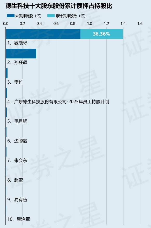 截止本公告日,股东虢晓彬已累计质押股份5083.0万股,占其持股总数的36.36%。本次质押后德生科技十大股东的累计质押股份占持股比例(占持股比例的计算以公司最新一期财务报表公布的十大股东的持股总数为基准)见下图: