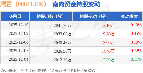 证券之星消息,12月10日南向资金增持2.1万股鹰君(00041.HK)。近5个交易日中,获南向资金增持的有4天,累计净增持27.3万股。近20个交易日中,获南向资金增持的有16天,累计净增持116.4万股。截至目前,南向资金持有鹰君(00041.HK)2041.76万股,占公司已发行普通股的2.72%。