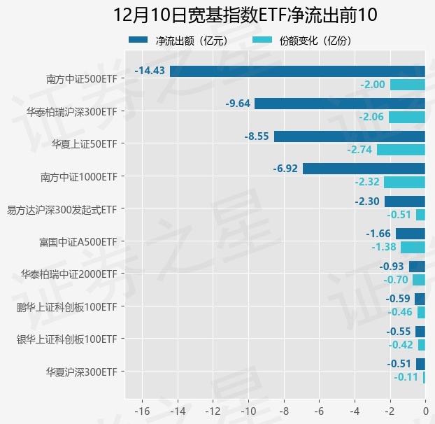 当日有81只宽基指数ETF基金出现资金净流出,其中净流出排首位的是南方中证500ETF(510500),份额减少了2.0亿份,净流出额为14.43亿元。