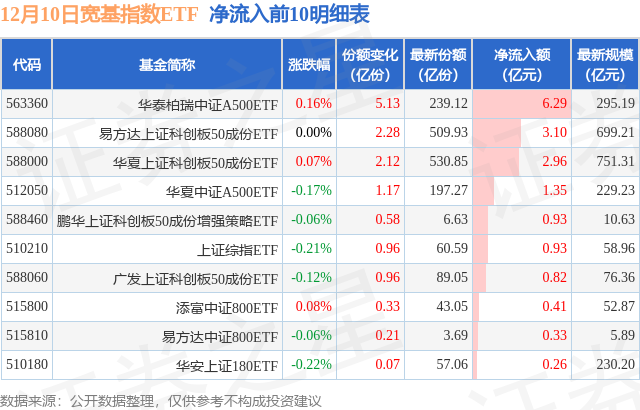 证券之星消息,12月10日宽基指数ETF基金合计资金净流出35.28亿元,近5个交易日累计净流入42.89亿元,5个交易日中出现日合计资金净流入的有3天(ETF资金流向计算公式:(当日ETF场内流通份额-前一交易日ETF场内流通份额)*当日ETF均价,计算结果仅供参考)。