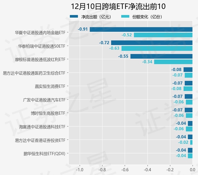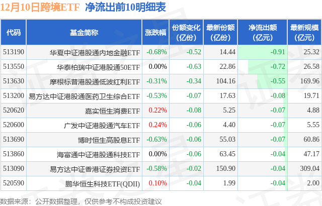 当日有16只跨境ETF基金出现资金净流出,其中净流出排首位的是华夏中证港股通内地金融ETF(513190),份额减少了5200.0万份,净流出额为9055.86万元。