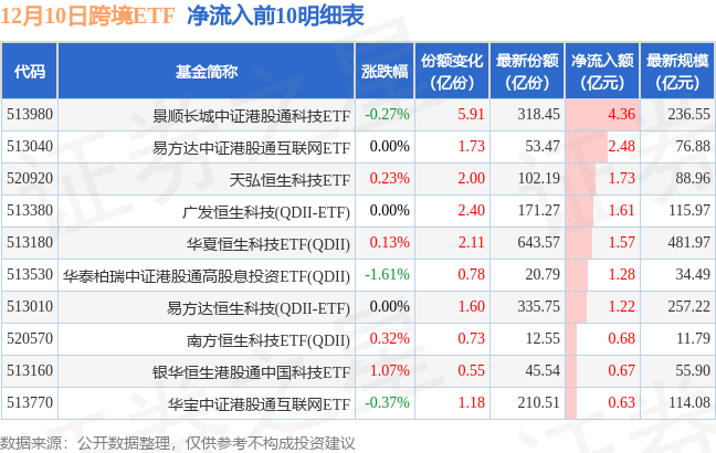 当日有48只跨境ETF基金出现资金净流入,其中净流入排首位的是景顺长城中证港股通科技ETF(513980),份额增加了5.91亿份,净流入额为4.36亿元。