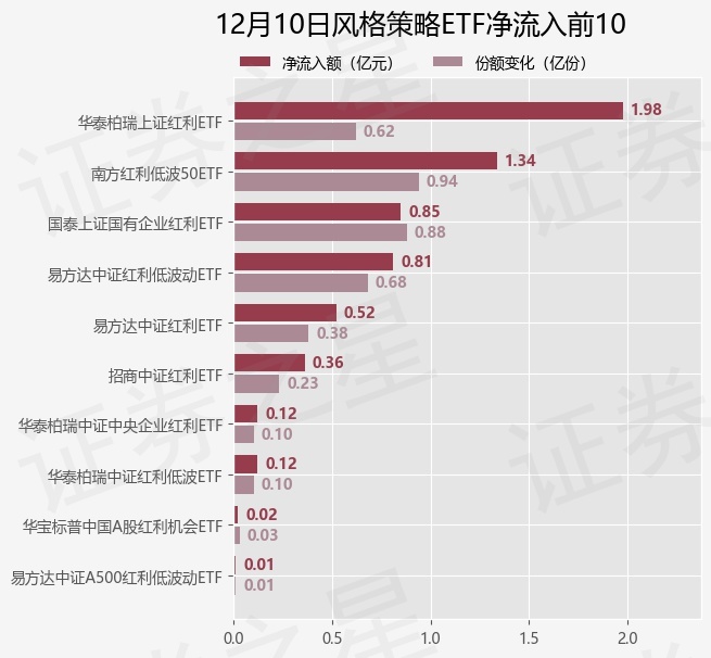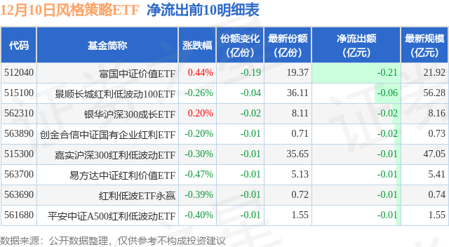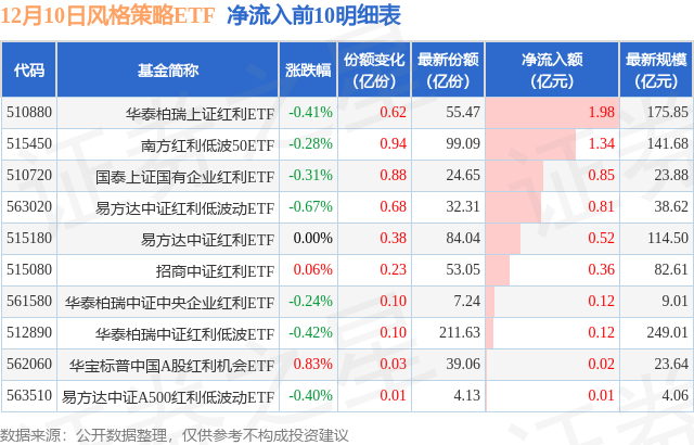 当日有12只风格策略ETF基金出现资金净流入,其中净流入排首位的是华泰柏瑞上证红利ETF(510880),份额增加了6250.0万份,净流入额为1.98亿元。