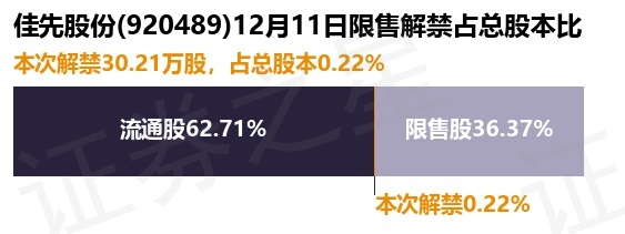 证券之星消息,根据市场公开信息整理,佳先股份(920489)于12月11日将有30.21万股限售股份解禁,为公司追加承诺限售股份上市流通,占公司总股本0.22%。(本次数据根据历史公告整理得出,实际情况以上市公司最新公告为准)本次解禁后,公司还有4963.37万股限售股份,占总股本36.37%。具体如下图所示:
