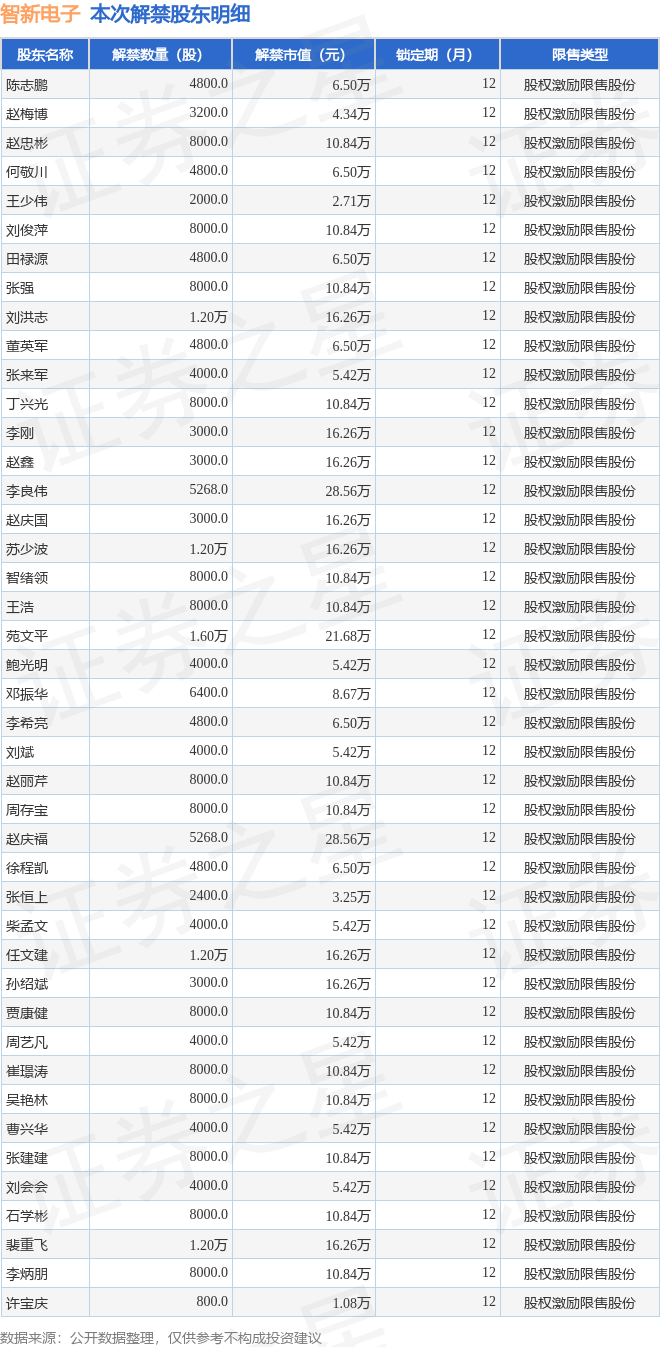证券之星消息,根据市场公开信息整理,智新电子(920212)于12月11日将有27.01万股限售股份解禁,为公司股权激励限售股份,占公司总股本0.25%。(本次数据根据历史公告整理得出,实际情况以上市公司最新公告为准)本次解禁后,公司还有5456.72万股限售股份,占总股本51.43%。具体如下图所示:
