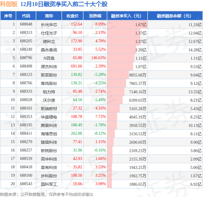 科创板融资净买入前三分别为:长光华芯(688048)融资净买入1.67亿元、仕佳光子(688313)融资净买入1.37亿元、德科立(688205)融资净买入1.37亿元,前20具体见下表: