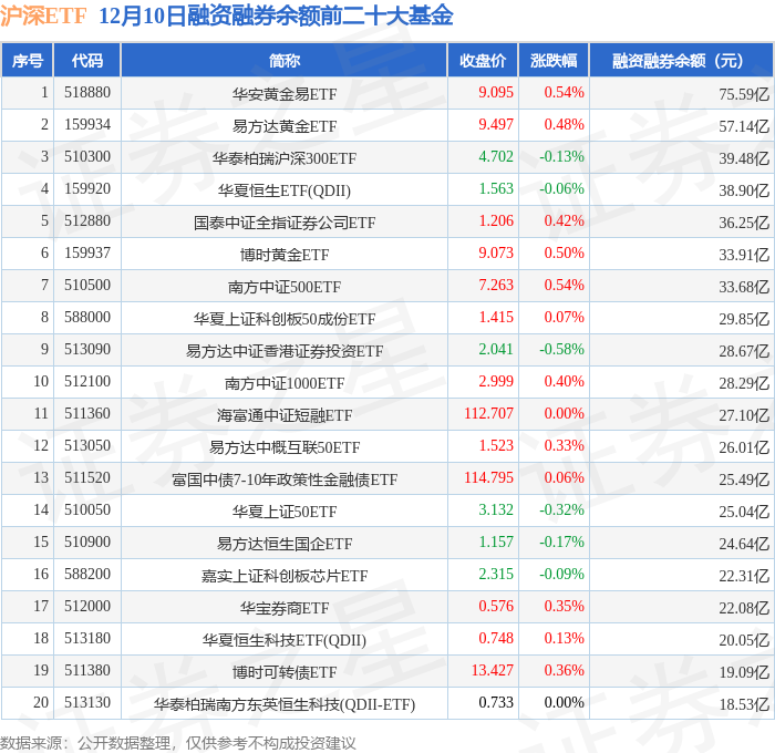 沪深ETF融资融券余额前三分别为:华安黄金易ETF(518880)融资融券余额75.59亿元、易方达黄金ETF(159934)融资融券余额57.14亿元、华泰柏瑞沪深300ETF(510300)融资融券余额39.48亿元,前20具体见下表: