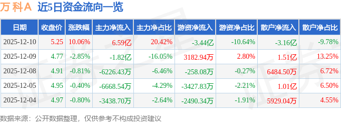 证券之星消息,截至2025年12月10日收盘,万 科A(000002)报收于5.25元,上涨10.06%,涨停,换手率6.55%,成交量636.21万手,成交额32.29亿元。