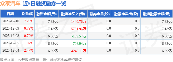 证券之星消息,截至2025年12月10日收盘,众泰汽车(000980)报收于4.12元,上涨7.29%,换手率7.85%,成交量394.91万手,成交额15.91亿元。