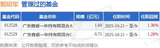 郭绍军先生:硕士研究生,中国,2018年3月1日加入广发基金管理有限公司,历任广发基金管理有限公司信息技术部数据中心岗、价值投资部量化研究员、稳健策略部量化研究员。2025年10月21日起担任广发鑫睿一年持有期混合型证券投资基金的基金经理。