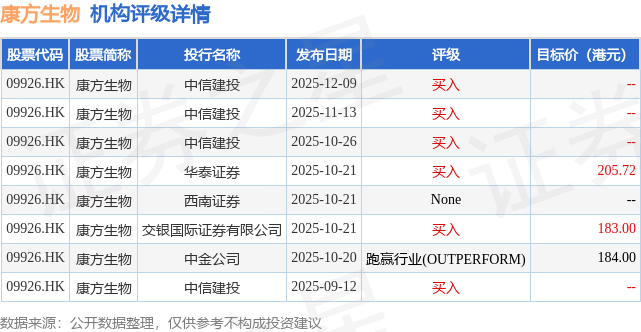 投行对该股的评级以买入为主,近90天内共有6家投行给出买入评级,近90天的目标均价为190.91港元。中信建投最新一份研报给予康方生物买入评级。