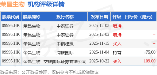 投行对该股的评级以增持为主,近90天内共有2家投行给出增持评级,近90天的目标均价为92港元。中泰证券最新一份研报给予荣昌生物增持评级。