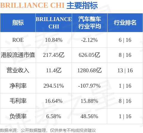 BRILLIANCE CHI港股市值217.45亿港元,在汽车整车行业中排名第8。主要指标见下表: