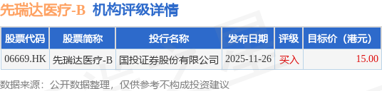 投行对该股的评级以买入为主,近90天内共有1家投行给出买入评级,近90天的目标均价为15港元。国投证券股份有限公司最新一份研报给予先瑞达医疗-B买入评级,目标价15港元。