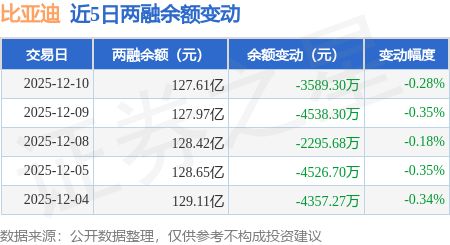 证券之星消息,12月10日,比亚迪(002594)融资买入1.53亿元,融资偿还1.89亿元,融资净卖出3623.86万元,融资余额127.13亿元。