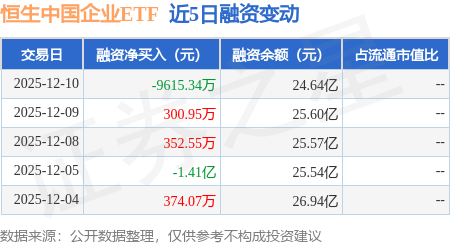 证券之星消息,12月10日,恒生中国企业ETF(510900)融资买入2031.14万元,融资偿还1.16亿元,融资净卖出9615.34万元,融资余额24.64亿元。