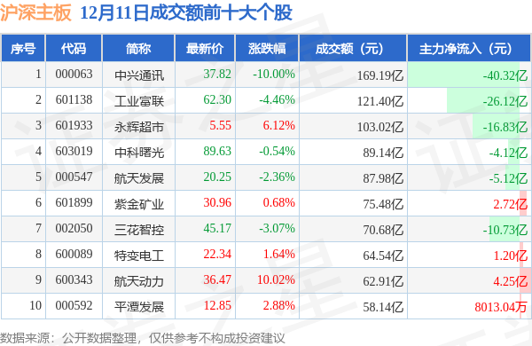 当日沪深主板成交额前10大个股中5只个股收涨,平均涨幅4.27%,其中中兴通讯(000063)以成交额169.19亿元排第一。从主力资金流入看,成交额前10大个股中有4只个股呈现主力资金净流入。