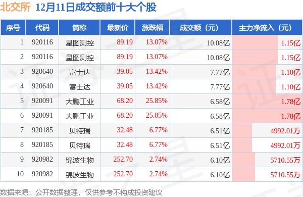 当日北交所成交额前10大个股全线收涨,平均涨幅12.37%,其中星图测控(920116)以成交额10.08亿元排第一。从主力资金流入看,成交额前10大个股中有10只个股呈现主力资金净流入。