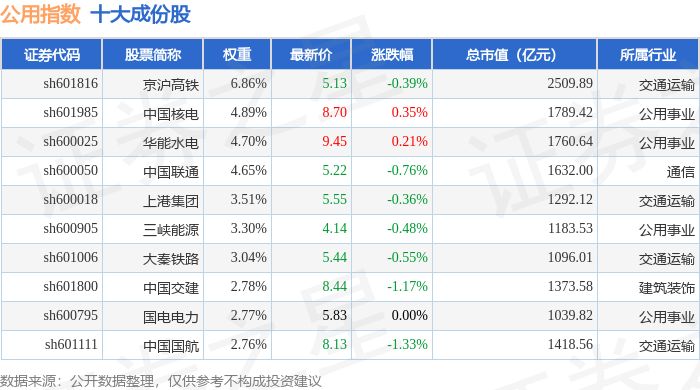 公用指数(000007)十大成份股详情如下:
