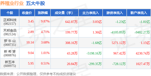 个股表现方面,养殖业行业当日领涨股为正邦科技(002157),该股当日报收3.45,上涨9.87%,成交量642.87万,主力资金净流入3.05亿元。天邦食品(002124)以上涨4.71%紧随其后,该股当日成交量199.77万,主力资金净流入1.36亿元。除此之外,罗 牛 山(000735)、新 希 望(000876)、新五丰(600975)均进入当日牛股之列。具体个股列表见下表: