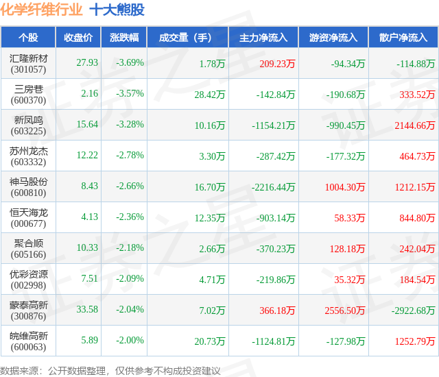 个股表现方面,化学纤维行业当日领跌股为汇隆新材(301057),该股当日报收27.93,下跌3.69%,成交量1.78万,主力资金净流入209.23万元。三房巷(600370)以下跌3.57%紧随其后,该股当日成交量28.42万,主力资金净流出142.84万元。除此之外,新凤鸣(603225)、苏州龙杰(603332)、神马股份(600810)均进入当日熊股之列。具体个股列表见下表: