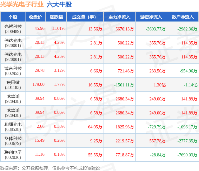 个股表现方面,光学光电子行业当日领涨股为光智科技(300489),该股当日报收45.96,上涨11.01%,成交量13.56万,主力资金净流入6676.13万元。纬达光电(920001)以上涨4.25%紧随其后,该股当日成交量2.81万,主力资金净流入506.22万元。除此之外,纬达光电(920001)、鸿合科技(002955)、东田微(301183)均进入当日牛股之列。具体个股列表见下表: