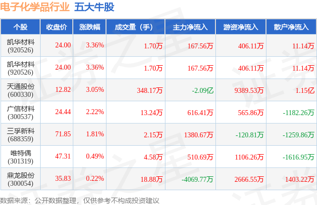 个股表现方面,电子化学品行业当日领涨股为凯华材料(920526),该股当日报收24.0,上涨3.36%,成交量1.7万,主力资金净流入167.56万元。凯华材料(920526)以上涨3.36%紧随其后,该股当日成交量1.7万,主力资金净流入167.56万元。除此之外,天通股份(600330)、广信材料(300537)、三孚新科(688359)均进入当日牛股之列。具体个股列表见下表: