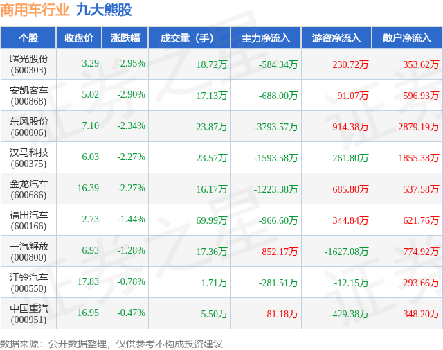 个股表现方面,商用车行业当日领跌股为曙光股份(600303),该股当日报收3.29,下跌2.95%,成交量18.72万,主力资金净流出584.34万元。安凯客车(000868)以下跌2.9%紧随其后,该股当日成交量17.13万,主力资金净流出688.0万元。除此之外,东风股份(600006)、汉马科技(600375)、金龙汽车(600686)均进入当日熊股之列。具体个股列表见下表:
