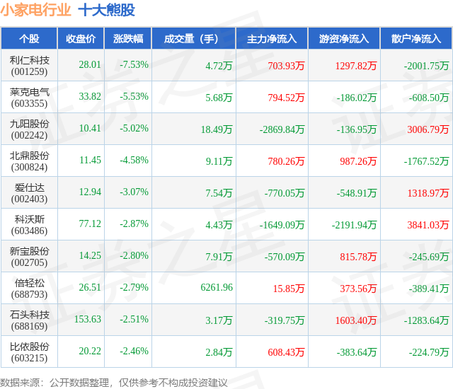 个股表现方面,小家电行业当日领跌股为利仁科技(001259),该股当日报收28.01,下跌7.53%,成交量4.72万,主力资金净流入703.93万元。莱克电气(603355)以下跌5.53%紧随其后,该股当日成交量5.68万,主力资金净流入794.52万元。除此之外,九阳股份(002242)、北鼎股份(300824)、爱仕达(002403)均进入当日熊股之列。具体个股列表见下表: