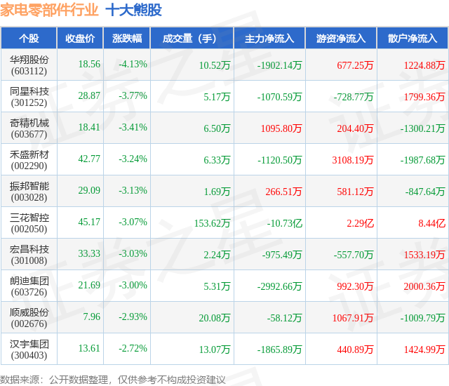 个股表现方面,家电零部件行业当日领跌股为华翔股份(603112),该股当日报收18.56,下跌4.13%,成交量10.52万,主力资金净流出1902.14万元。同星科技(301252)以下跌3.77%紧随其后,该股当日成交量5.17万,主力资金净流出1070.59万元。除此之外,奇精机械(603677)、禾盛新材(002290)、振邦智能(003028)均进入当日熊股之列。具体个股列表见下表: