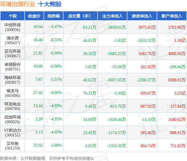 个股表现方面,环境治理行业当日领跌股为中创环保(300056),该股当日报收10.04,下跌9.47%,成交量63.21万,主力资金净流出5839.61万元。清水源(300437)以下跌8.55%紧随其后,该股当日成交量44.01万,主力资金净流出1.02亿元。除此之外,圣元环保(300867)、卓锦股份(688701)、海峡环保(603817)均进入当日熊股之列。具体个股列表见下表: