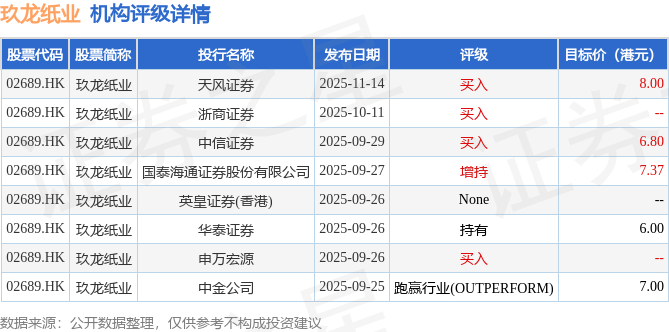 截至2025年12月11日收盘,玖龙纸业(02689.HK)报收于6.08港元,上涨0.5%,成交量936.28万股,成交额5791.3万港元。投行对该股的评级以买入为主,近90天内共有4家投行给出买入评级,近90天的目标均价为7.03港元。天风证券最新一份研报给予玖龙纸业买入评级,目标价8港元。