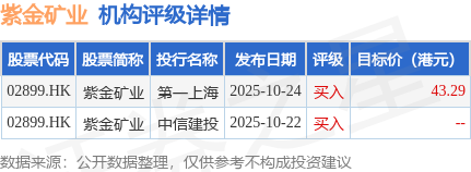 截至2025年12月11日收盘,紫金矿业(02899.HK)报收于33.08港元,上涨0.36%,成交量4403.12万股,成交额14.77亿港元。投行对该股的评级以买入为主,近90天内共有2家投行给出买入评级,近90天的目标均价为43.29港元。第一上海最新一份研报给予紫金矿业买入评级,目标价43.29港元。