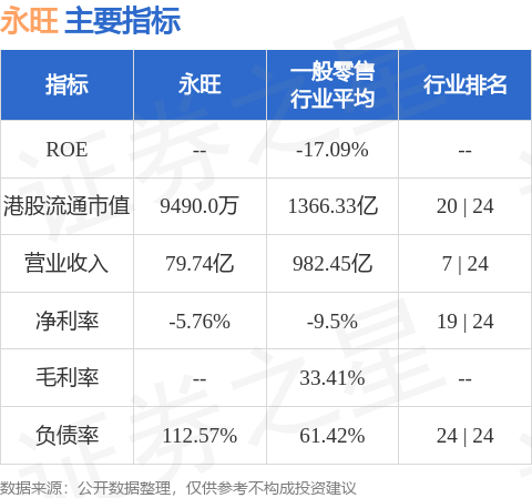 永旺港股市值9490万港元,在一般零售行业中排名第20。主要指标见下表: