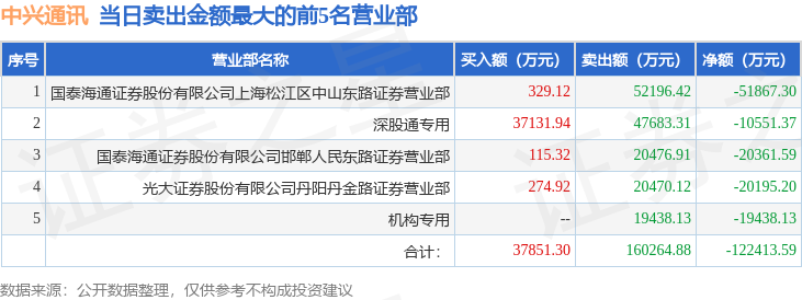 证券之星消息,沪深交易所2025年12月11日公布的交易公开信息显示,中兴通讯(000063)因日跌幅偏离值达到7%的前5只证券登上龙虎榜。此次是近5个交易日内第1次上榜。