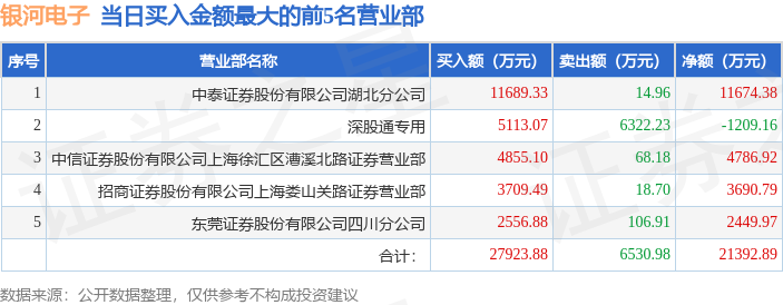 证券之星消息,沪深交易所2025年12月11日公布的交易公开信息显示,银河电子(002519)因日涨幅偏离值达到7%的前5只证券登上龙虎榜。此次是近5个交易日内第1次上榜。