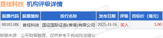 截至2025年12月11日收盘,首佳科技(00103.HK)报收于3.51港元,上涨0.29%,成交量18.4万股,成交额64.15万港元。投行对该股的评级以买入为主,近90天内共有1家投行给出买入评级,近90天的目标均价为5港元。国证国际证券(香港)有限公司最新一份研报给予首佳科技买入评级,目标价5港元。